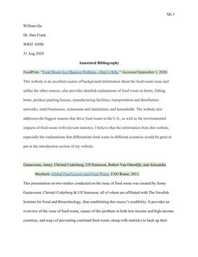 After completing an extensive amount of research, I decided to compile all the research I did thus far in an annotated bibliography that clearly outlined my sources with an evaluation of each source based on relevance, credibility, and quality. Making the annotated bibliography during my research process helped me gain a deeper understanding of the food waste problem. It also helped me distinguish my prior views and biases from actual credible research. Most importantly, though, this process allowed me to evaluate the credibility of all my sources so that I had the most reliable and high-quality sources to use in my website's content.